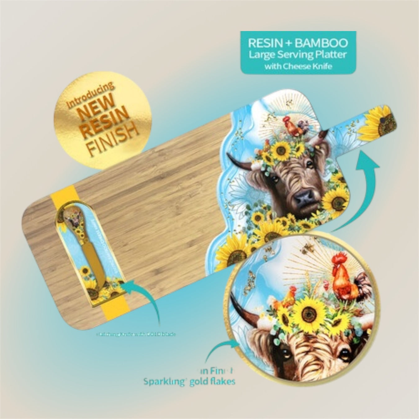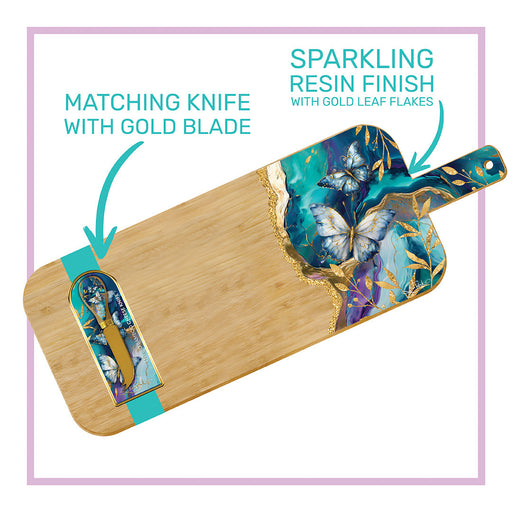 View full detailsBamboo Serving Platter with resin overlay and gold flakes. Includes matching cheese knife with gold blades and printed backing card with gold detai...