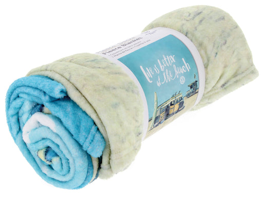 This cozy light blue fleece blanket featuring a vintage style beach design with a VW T2 Bus and the slogan "Life is Better at the Beach" will give ...