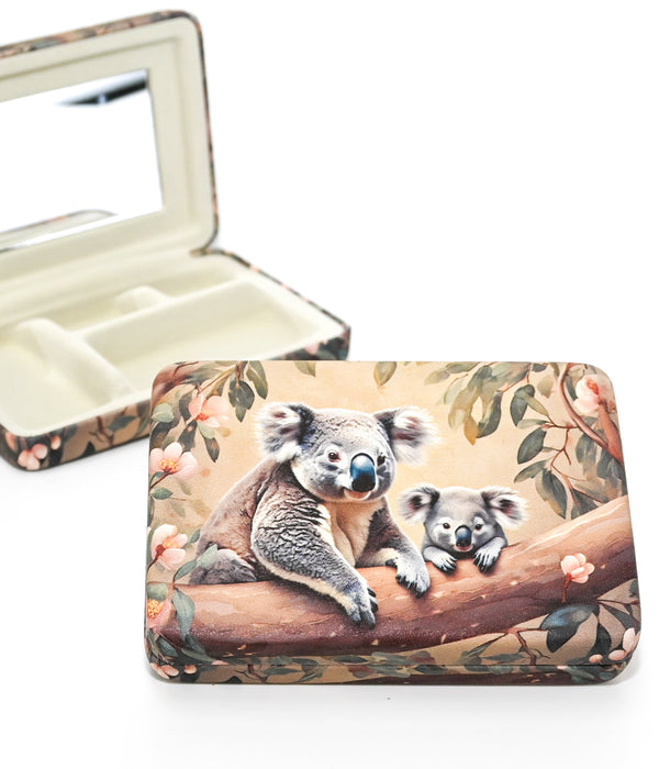 Safely store your jewellery, coins, and other small items in our high-quality PU travel box. Designed in Australia and featuring AI art by Camo, this 10x7x2cm box includes a soft velvet lining, clam shell lid, and vanity mirror for ultimate convenience. Expertly protect and transport your valuables wherever you go.