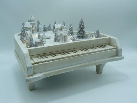 Piano with White Christmas Scene, LED Lights and Spinning Tree/Train