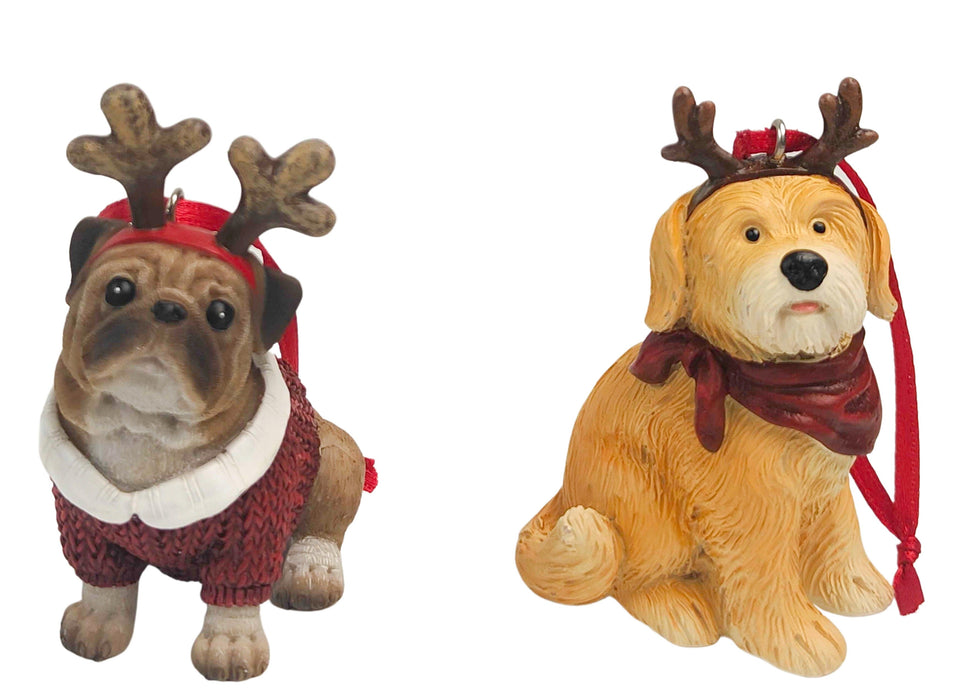 Reindeer Dog Tree Decoration - Resin Pug or Scruffy Dog